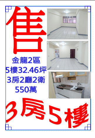 售公寓3房2廳2衛金龍2區5樓請電:0971-262289 02-26461721